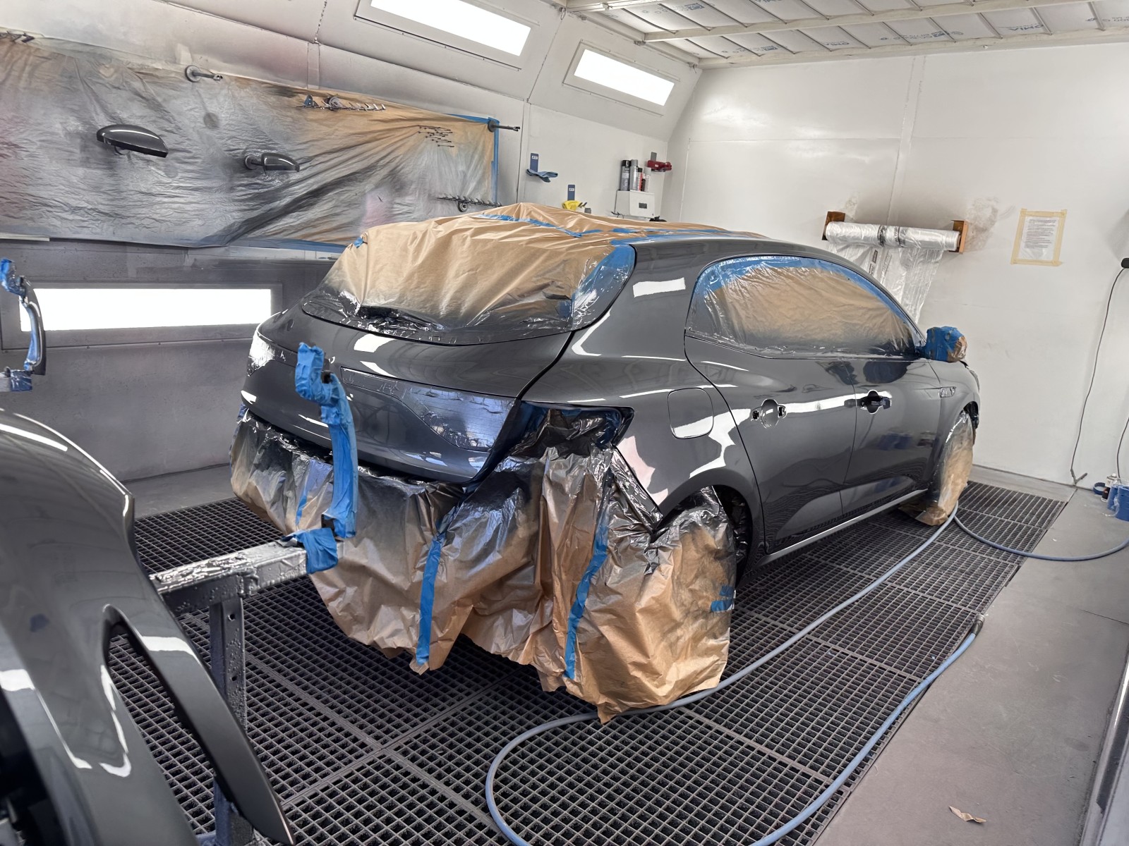 Lors des travaux nous avons égalisé les rayures, poncé toutes les surfaces, apprêté la voiture entièrement, poncé l'après ,préparé la voiture pour la mise en peinture, peint la voiture dans son intégralité, une fois la voiture sèche, nous avons remonté le véhicule, lavé l'intérieur et l'extérieur avant de contacter notre client pour qu'il puisse récupérer son véhicule après son travail. La franchise lui a été offerte et notre client plus que satisfait.